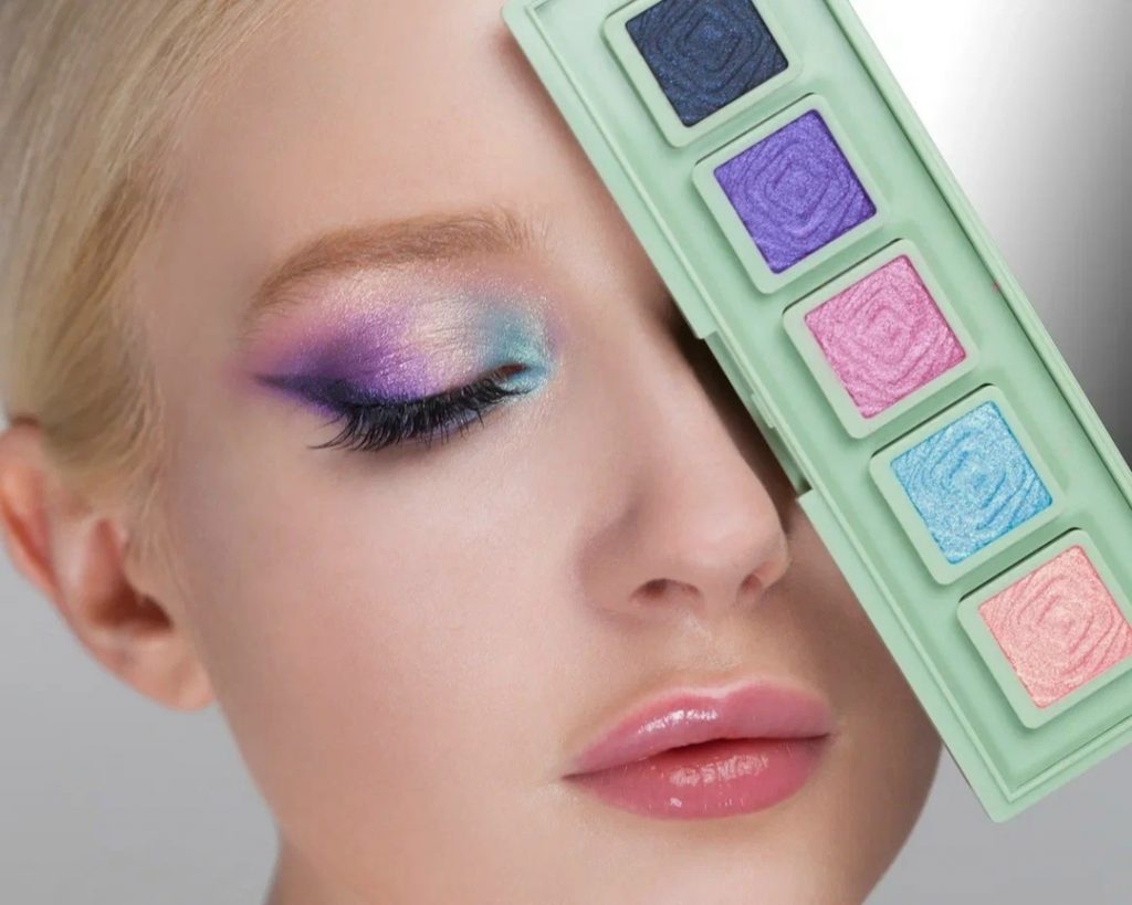 Голубые тени есть у нас в палетке Carnival. Фантазийная палетка сочетает в себе множество ярких и креативных оттенков. Здесь есть сатиновый бирюзово-золотой дуохромный оттенок, который как раз в тренде 2026 года. Все тени размещены в индивидуальных съемных рефилах с системой фиксации, поэтому вы можете составлять персональные наборы и заменять отдельные цвета из разных палитр. У каждого оттенка в палетке отличные пигментация и стойкость, а также способность к растушевке.