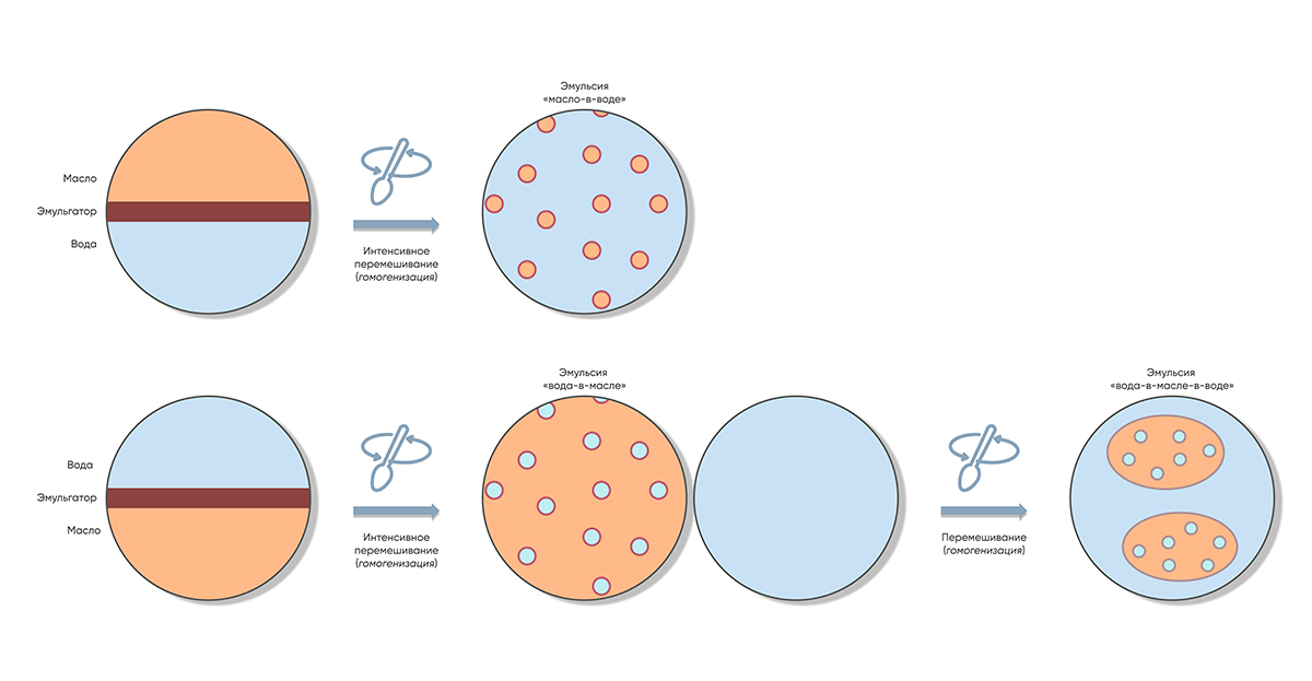 В зависимости от преобладания водной или масляной фазы эмульсии могут быть: